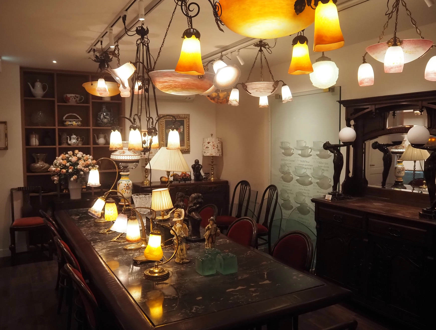 静かな空間の中で、アンティーク家具や雑貨をご覧いただけます。写真では伝わりきらない質感や重みを感じながら、心に響く一品との出会いをお楽しみください。
